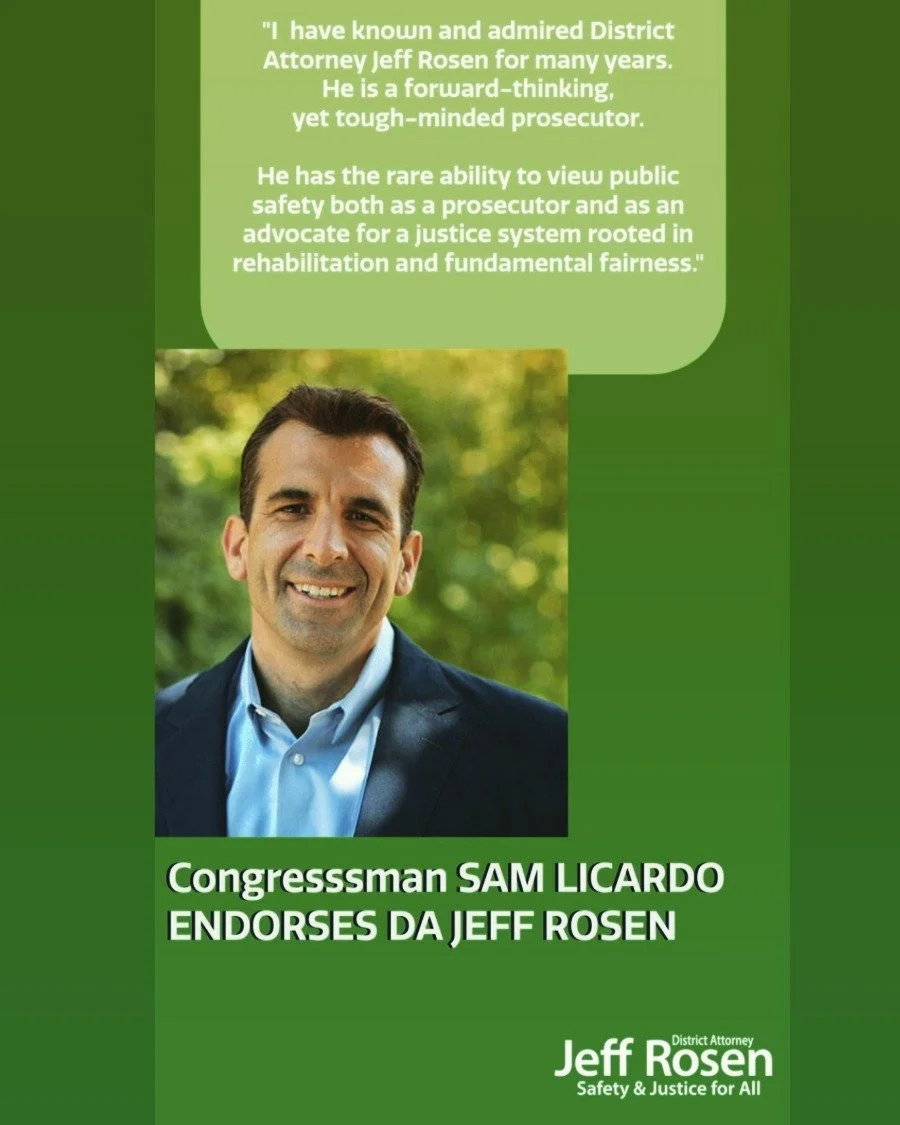 "District Attorney Jeff Rosen is a rare prosecutor who has skillfully implemented criminal justice reforms while simultaneously supporting victims’ rights and local law enforcement.”